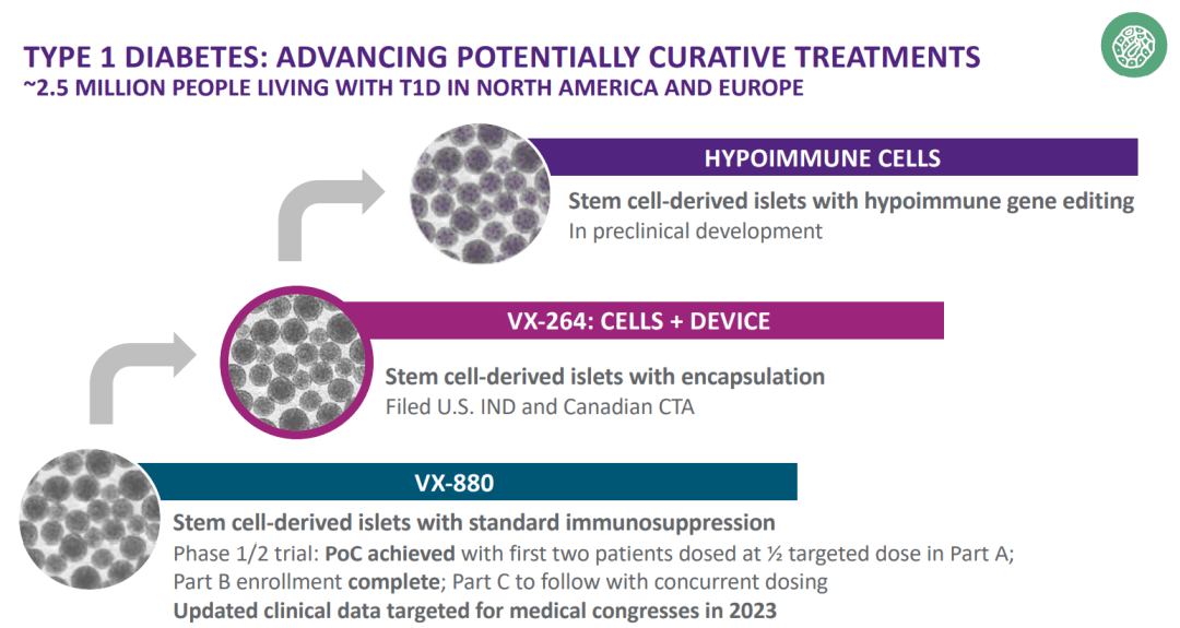 Vertex正在采用多種研究方法,使用干細胞衍生的胰島,以取代T1D患者體內(nèi)破壞的產(chǎn)生胰島素的胰島細胞。Vertex在T1D的第一個臨床研究項目VX-880是一種干細胞衍生的、完全分化的、產(chǎn)生胰島素的胰島細胞替代療法,與免疫抑制結(jié)合使用。Vertex已在VX-880項目中證明了概念的臨床證明,美國和加拿大正在進行1/2期臨床研究。