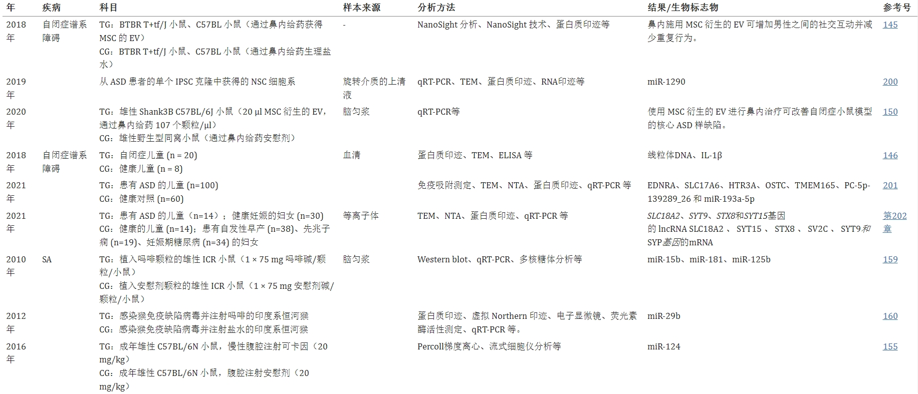 相關研究還表明,EVs在其他精神障礙(包括ASD、SA、SD和創傷后應激障礙)中也起著關鍵作用。表1總結了最新和有代表性的前期和臨床研究。值得注意的是,這些精神疾病與前述疾病(包括精神分裂癥、MDD和BD)之間的易感性有重疊,這很可能可以通過相同EVs或其載體的失調來治療。