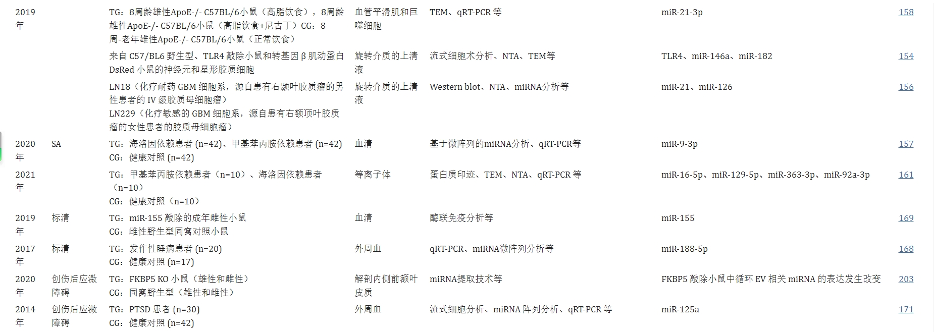 研究表明這些疾病可能具有相似的病理生理機制。盡管越來越多的新興研究關注EV相關miRNA和PTSD的其他生物標志物,但大多數研究結果仍需要進一步的臨床驗證。