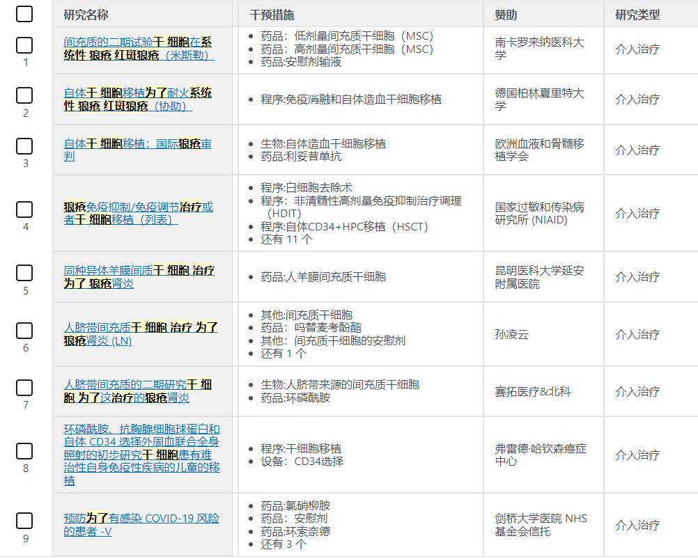 據ClinicalTrials.gov (https://clinicaltrials.gov) 報道,目前使用干細胞治療系統性紅斑狼瘡的患者的臨床試驗9項,另外還有39項針對其他相關自身免疫性疾病的臨床試驗。