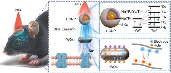 通過“近紅外光穿透+光電轉換”機制實現深部腦區調控:納米顆粒將近紅外光轉化為藍光,光伏材料進一步將藍光轉化為局部電刺激,無需基因修飾即可精準干預神經活動。