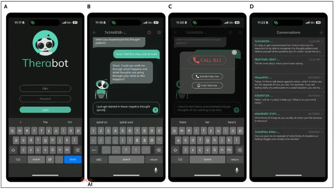 2025年3月27日,美國達特茅斯學院Geisel醫學院團隊在《NEJM AI》發表了全球首個基于LLM、經過精神科醫生等專家微調的生成式AI聊天機器人治療精神疾病的隨機對照試驗結果:患者使用聊天機器人四周后(人均總對話時長:6.18小時),重度抑郁、廣泛性焦慮以及高風險進食障礙癥狀獲得顯著改善,并且這種改善維持至第八周。[11]