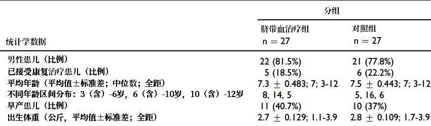這項臨床研究入組了54名患兒,平均分為兩組。治療組的27人在大約一個月內(nèi)接受了4次臍帶間充質(zhì)干細胞輸注(單次細胞量為5×10^7,每次間隔7天),而對照組的27人輸注的是0.9%生理鹽水。兩組受試者均同時接受基礎(chǔ)康復(fù)治療。