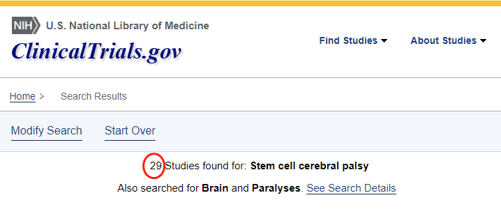 截止2022年12月,在美國國立衛(wèi)生研究院的最大臨床試驗注冊庫clinicaltrials.gov網(wǎng)站上注冊的有關(guān)干細胞治療小兒腦癱的臨床研究項目有29項,其中中國有三項。所涉及干細胞類型有神經(jīng)干細胞、骨髓干細胞、臍帶間充質(zhì)干細胞等,其中有些項目已經(jīng)完成,有些正在招募。