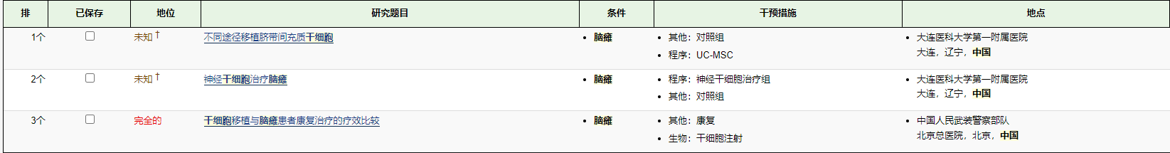 | 9 | | 未知 ? | 神經(jīng)干細胞治療腦癱 | 腦癱 | 程序:神經(jīng)干細胞治療組其他:對照組 | 大連醫(yī)科大學(xué)第一附屬醫(yī)院 |