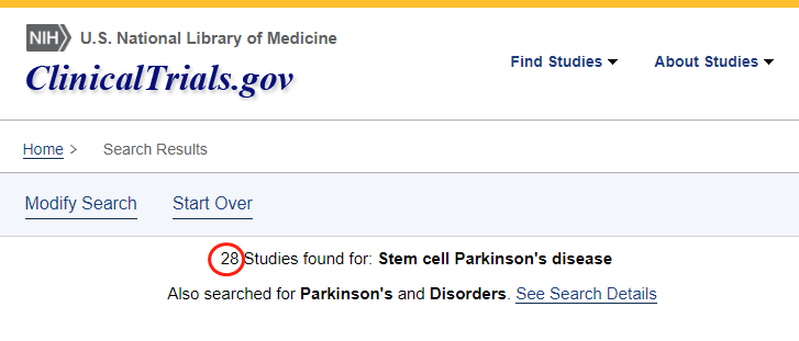 截止2022年12,在美國國立衛生研究院的最大臨床試驗注冊庫clinicaltrials.gov網站上注冊的有關干細胞治療帕金森的臨床研究項目有28項。