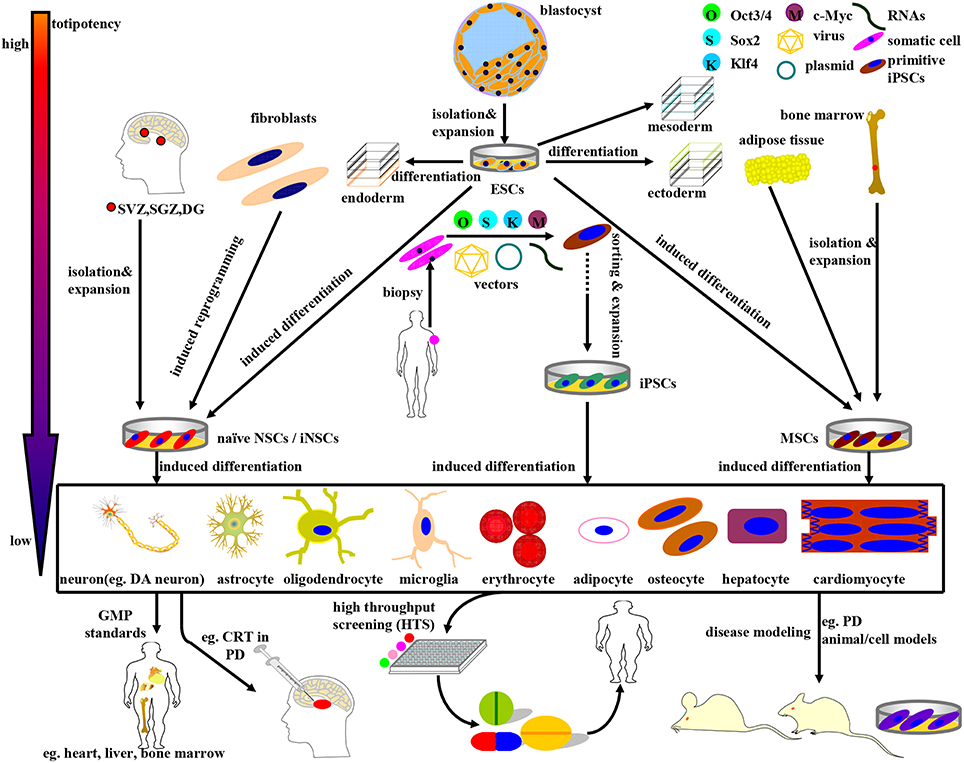 整個過程分為以下三個步驟: (1) 從胚泡內塊分離胚胎干細胞;(2) 通過 (i) 應用形態發生素或可溶性生長因子誘導ESC分化為DA神經元;(ii) 飼養細胞共培養;(iii) 遺傳操作;(iv) 底板譜系誘導策略;(3) 通過功能整合和內源性NPCs動機在PD治療中移植誘導的DA神經元。