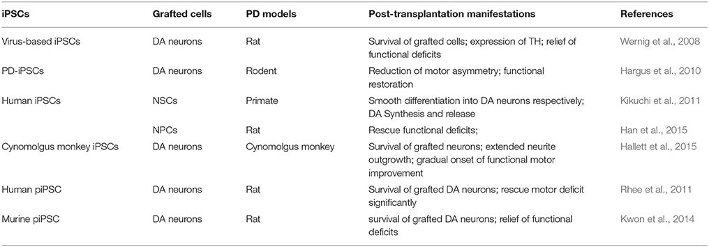 研究表明,基于蛋白質的人類iPSC很有希望成為臨床轉化的有前途的細胞來源,這些hiPSC的行為與hESC相似,沒有異常衰老/細胞凋亡,沒有顯示任何外源性重編程基因表達,并且DA神經元來自人類piPSC顯著改善PD嚙齒動物模型中的行為缺陷(參見表3)。總之,對于與PD相關的干細胞研究和治療領域,除了現有的基于病毒和蛋白質的iPSCs外,還應將更多的精力和注意力投入到多元化建立的iPSCs上,這將極大地促進CRT的進一步發展如果實施,用于PD治療。