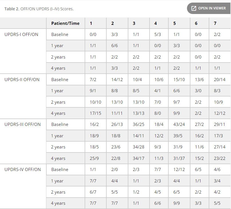 在他們的1年、2年和4年評估中,患者在Hoehn&Yahr量表(表4)上的分期以及在Schwab和England量表上的評級(表4)僅顯示出微小的變化,除了P1,誰的分數明顯變差了。