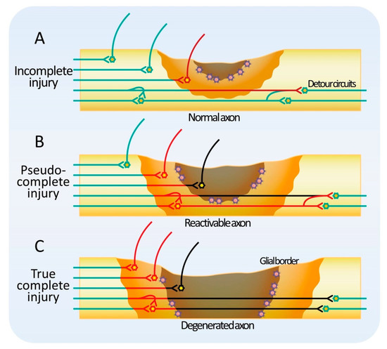 ( C ) 真正的完全傷害。無(wú)神經(jīng)組織(灰色)橫跨整個(gè)脊髓,在頭端或尾端對(duì)周圍可再激活組織的治療無(wú)法提供功能性顱骨連接。