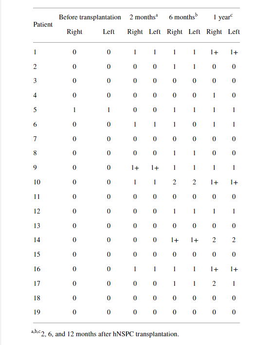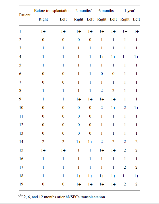 沒有死亡率。在神經干/祖細胞植入后,沒有患者出現感染、腦脊液滲漏、嚴重危及生命的自主神經反射異?;蜻M行性脊柱畸形。由于直接將細胞注射到受傷的脊髓中,術后感覺和運動功能、膀胱并發癥或神經水平沒有惡化。沒有患者表現出呼吸功能惡化,所有參與者似乎都應對得很好。