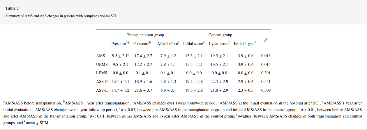 然而,分別轉換為AIS-C和AIS-B的患者7和8在移植后1年分別顯示LEMS增加2分和ASS-L增加54分(表7和9)。在不完全性SCI中,與對照組相比,移植組中的兩名患者在1年時表現出更大的LEMS和ASS-P增加(表6–9)。