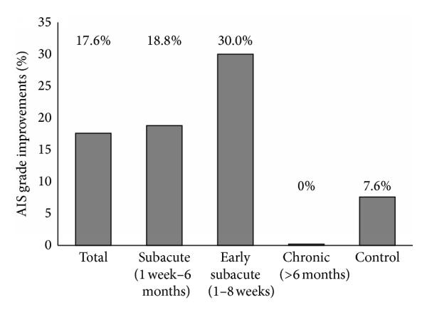 方法:研究人員選擇了 19 名患者進行神經干/祖細胞移植。根據損傷發作與神經干/祖細胞移植之間的時間窗,符合條件的患者分為四組:急性(<1 周)和、早期亞急性(1-8 周)、晚期亞急性(9 周-6 個月)和慢性(>6 個月)。對照組15例外傷性頸椎SCI患者均行椎管減壓手術后轉診至醫院康復門診。他們沒有接受脊髓損傷的神經干/祖細胞植入。