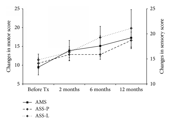 然而,移植組UEMS超過 1 年的平均變化顯著大于對照組(對比; ),而ASS-P和ASS-L超過1年的平均變化在兩組中沒有顯著差異(表5)。在移植組的AIS-A患者中,AIS分級轉換與AMS和ASS超過1年的變化之間沒有明顯的相關性。