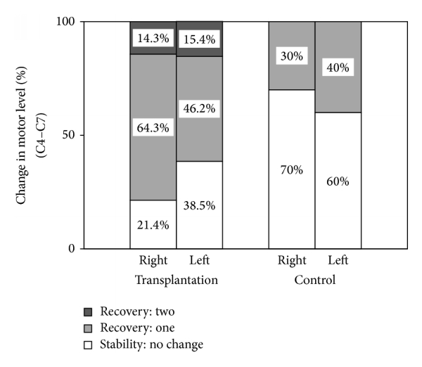 在移植組和對照組中初始運動水平為C4至C7的AIS-A SCI受試者中,沒有患者在1年內因一個或多個運動水平而惡化(表4)。在基線評估后1年,兩組中初始C4–C7或C5–C7 SCI 的個體在右側和左側具有穩定或正在恢復的運動水平的比例如圖4所示。對于移植組初始C5–C7 SCI的受試者,運動水平保持不變,分別為 9.1% 和 36.3%(右側和左側,分別為72.7%和45.5%,提高了一個水平,18.2%提高了兩個水平% 和 18.2%。AIS 等級轉換似乎不會影響電機水平變化。然而,在對照組中,運動水平在 85.7% 和 50.0%(分別為右側和左側)中保持不變,在14.3%和50.0%中提高了一個水平,沒有患者恢復兩個水平(圖4(b) ))。在1年時兩組中具有穩定或恢復運動水平的初始C4-C7運動水平SCI個體的比例與具有初始C5-C7運動水平的患者相似(圖4(a))。
