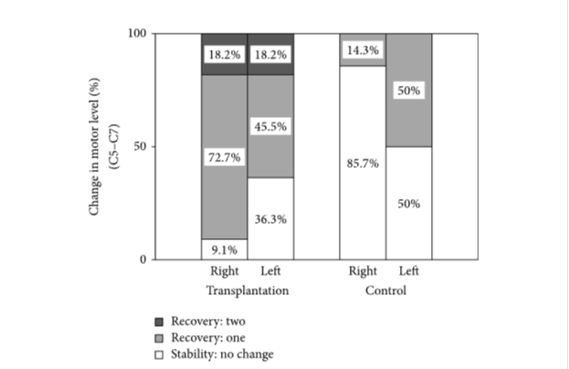 因此,與對照組相比,移植組中AIS-A患者在1年時恢復了一個或多個運動水平的比例更高。在基線時,兩組完全SCI患者的神經損傷水平以下沒有部分保留區域。