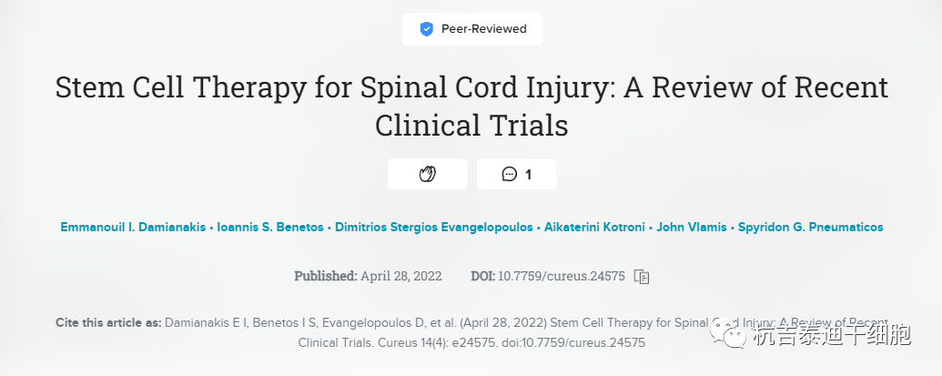 近期,雅典KAT醫(yī)院醫(yī)學(xué)院在《Cureus》醫(yī)學(xué)雜志期刊上發(fā)表一篇關(guān)于干細(xì)胞療法在脊髓損傷方面進(jìn)行的臨床試驗(yàn)的文章,文章側(cè)重于介紹SCI的病理生理學(xué)、用于治療的不同干細(xì)胞療法的特點(diǎn),以及這些療法在最近發(fā)表的臨床試驗(yàn)中的結(jié)果。
