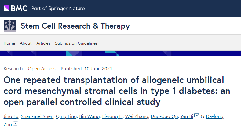 近年來,南京大學鼓樓醫院在《Stem Cell Research & Therapy》網站上發布了一項關于間充質干細胞移植治療1型糖尿病的臨床研究,研究的目的是檢驗重復進行間充質干細胞治療1型糖尿病患者的療效和安全性。