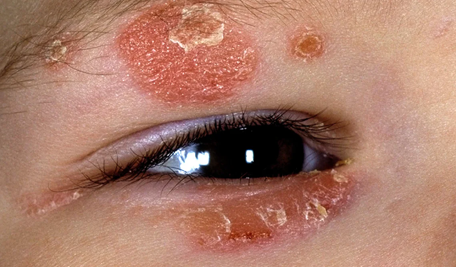 死亡的細(xì)胞會(huì)迅速轉(zhuǎn)移到皮膚外層并堆積起來(lái),形成覆蓋著片狀銀色鱗屑的褪色斑塊。皮膚還會(huì)發(fā)炎。