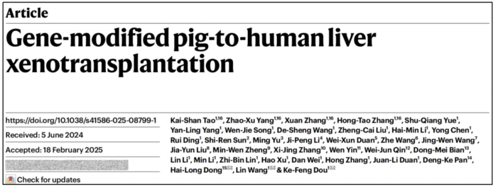 2025年1月7日,空軍軍醫大學西京醫院竇科峰院士團隊完成全球首例“原位豬全肝”人體移植:將一只經過基因編輯的豬肝,原位植入一名腦死亡患者體內。手術恢復血流后,豬肝迅速開始分泌膽汁,并承擔起正常肝臟的生理功能,驗證了其在人體內工作的可行性。[1]