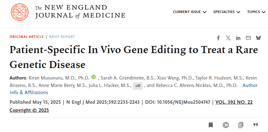 2025年2月25日,全球首個為個體定制的體內堿基編輯療法成功應用于臨床,挽救了一名6個月大男嬰的生命。這項發表于《新英格蘭醫學雜志》的案例,為罕見遺傳病的精準治療開辟了新路徑。[3]