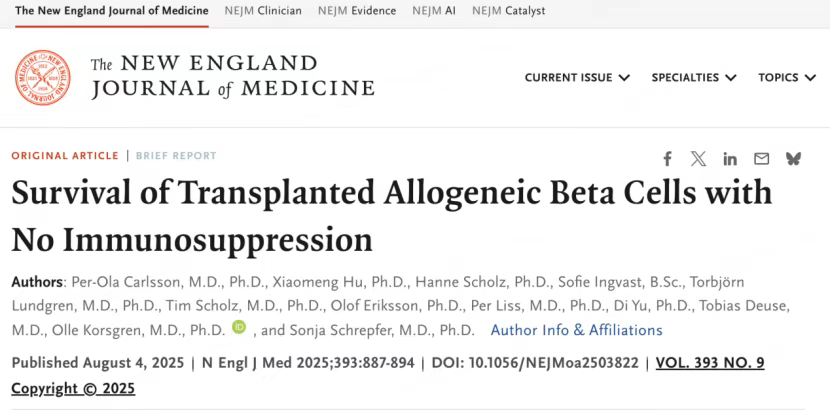 2025年8月4日,瑞典烏普薩拉大學等機構研究人員在《新英格蘭醫學雜志》(NEJM)發表重磅研究,全球首次通過基因編輯改造的異體胰島β細胞,在不使用免疫抑制劑的情況下,成功治療了一名病史長達37年的1型糖尿病患者。[6]