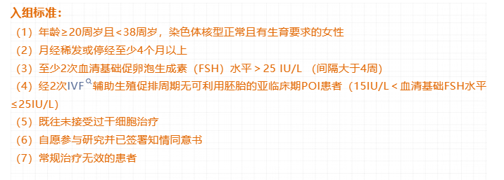 現最終招募20名患者POI(基礎FSH 15–40 IU/L),入組后所有研究相關檢查和治療費用全免,包括術前檢查、細胞增殖及B超說明、腹腔鏡晚干細胞注射手術及麻醉費用,以及臍帶間充質干細胞和重組生長激素的使用。